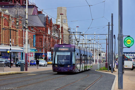 Blackpools erste Straßenbahn nahm ihren Dienst im Jahre 1885 auf. Einzigartig waren die Doppelstock Triebwagen. Seit 2012 verkehrt die neue Tram. Sie wurde von Bombardier Transportation gebaut. Baujahr 2011-2012, Anzahl 16 Stück in fünfteiliger Ausführung.