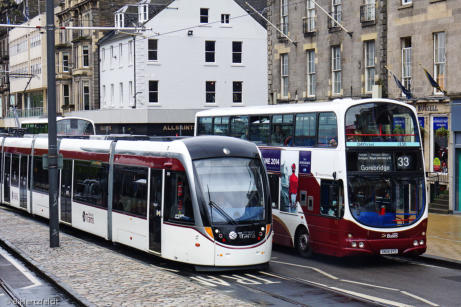 02.-18.06.2014: Die neue Tram von Edinburgh. Sie ging am 31.05.2014 in Betrieb. Hersteller ist Construcciones y Auxiliar de Ferrocarriles. Beim Bau der Zweirichtung-Niederflurbahnen waren unter anderem Vossloh Kiepe (elektrische Ausrüstung) beteiligt.Die Streckenlänge beträgt 14 km und ist mit 15 Haltestellen bestückt. Es wurden 27 Fahrzeuge beschafft.