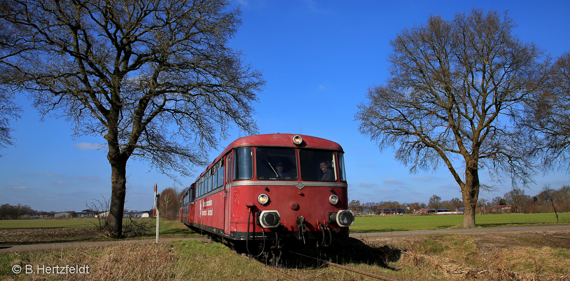 12.03.2016: Mit dem Triebwagen der Museumsbahn Ammerland Saterland auf dem Abschnitt Cloppenburg- Friesoythe ( ex Kbs. 220d). Auf der Rückfahrt von Friesyothe kurz hinter dem Ort kreuzt die Bahn die Straße Griesen Stein.