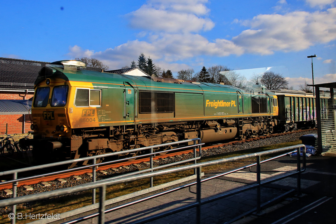12.03.2016: Mit dem Triebwagen der Museumsbahn Ammerland Saterland auf dem Abschnitt Cloppenburg- Oldenburg. Im Bahnhof Ahlhorn (Kbs 392) wartet Freightliner 66 004 auf freie Fahrt.