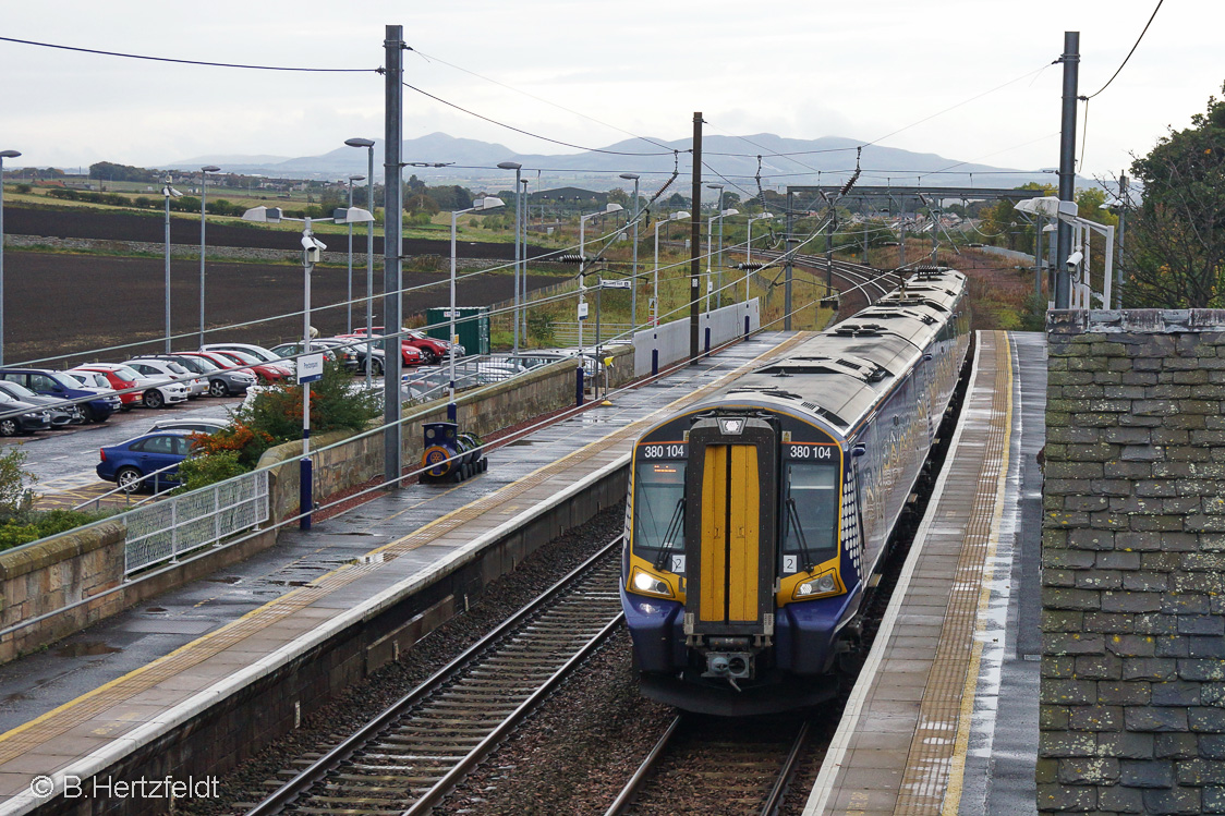 11.10.2017: Ein Vorortzug vom Typ Class 380 auf der East Coast Main Line durchfährt die Station Prestonpans.