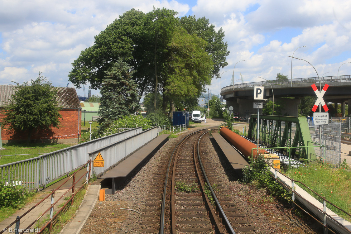 10.06.2017: Der Rbf. Hamburg-Süd und das HHLA Container Terminal Tollerort sowie der Rbf Hohe-Schaar liegen hinter uns.Wir befahren den Streckenabschnitt Richtung BLG Auto Terminal . Am Bü Kattwykstraße endet unser Fahrt. Auf dem Rückweg befahren wir die Gleisgruppe Roeloffsufer Richtung Hamburg-Süd. Erneut befahren wir die Ellerholzschleusenbrücke.