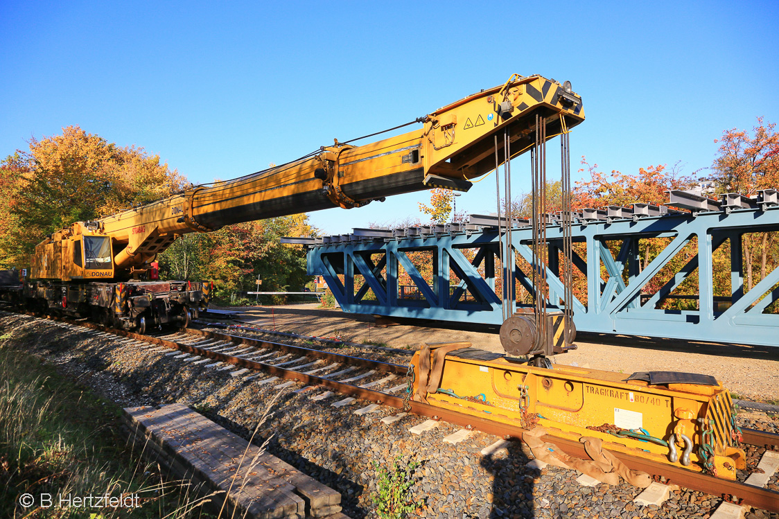 15.10.2018: Brückenbaustelle in Kiel-Wellingdorf und Kiel-Oppendorf. Heute wurde das zweite Brückenteil eingesetzt. Strabag Kran 99 80 9419 005-0 D-BRS vom Typ Kirow nimmt sich der Sache an. Das Eigengewicht liegt bei 111 Tonnen.