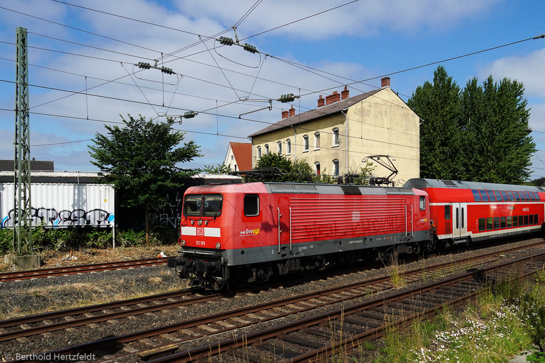 28.06.2019: 112 169 vor einer Dosto Einheit verläßt den Hbf. Kiel Richtung Neumünster.
