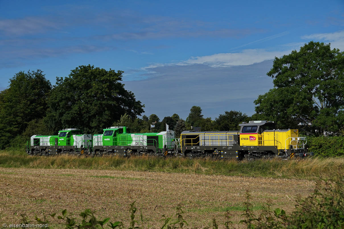 05.08.2020: Vossloh gleich mit drei DE18 auf Testfahrt in Altenholz-Klausdorf bei Kiel. DE18 mit der Nummer 2414 für IT; Mitte ohne NVR Akiem 679030 (gelb)