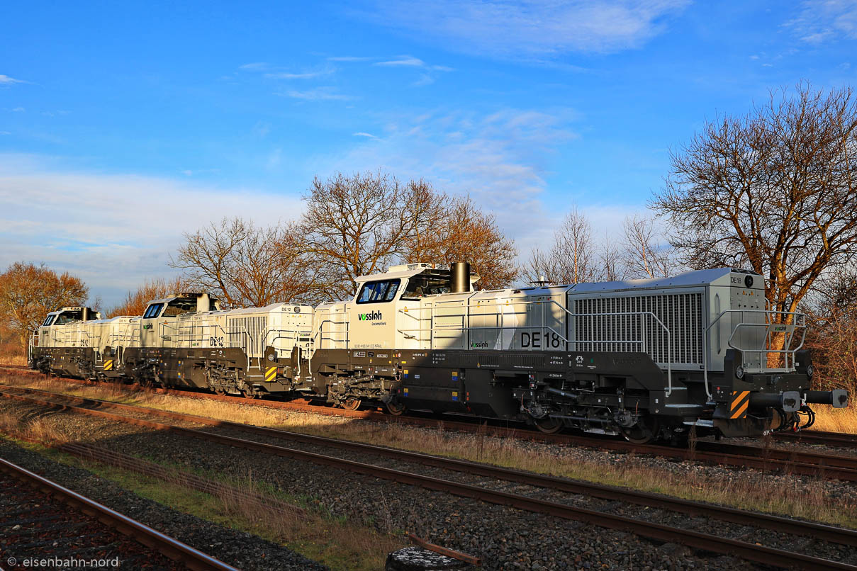 26.11. -27.12.2020: Ausbau Kiel-Schönberg; Nahverkehr; 181 215 mit neuen Vossloh Loks. Northrail erhält DE18 von Vossloh. 111 191 erreicht Kiel.