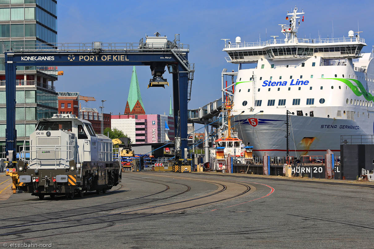 17.08.2020: Vossloh im "new lock" auf dem Weg zu einem Fototermin am Schwedenkai in Kiel. Es ist die DE 18 mit der NVR: 92 80 4185 040-7 D-VL. Im Hintergrund die Stena Line.