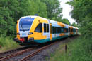 16.-30.06.2023: Bute Verkehre zur Kiel-Woche. RDC V60 auf der Anschlussbahn Richtung Friedrichsort. Railadventure mit Überführung im Eidertal.