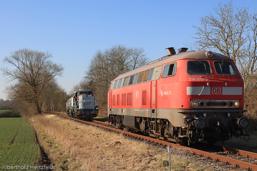 20.03.2025: 218 470 verbleibt am Bü Klausdorf-Alteholz. Die Nexrail, 92 82 4185 220-3 L-NXRL (grau) absolviert ihre Bremsfahrten.